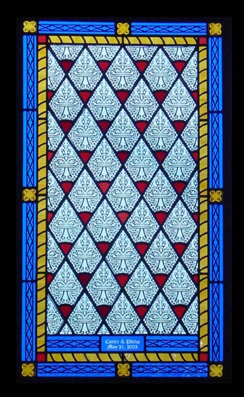 This window is created mostly by silk screening. It was inspired by the church where the couple was married. By taking pictures of the windows, I could recreate the same look and feeling of that memorable moment in a personal gift.